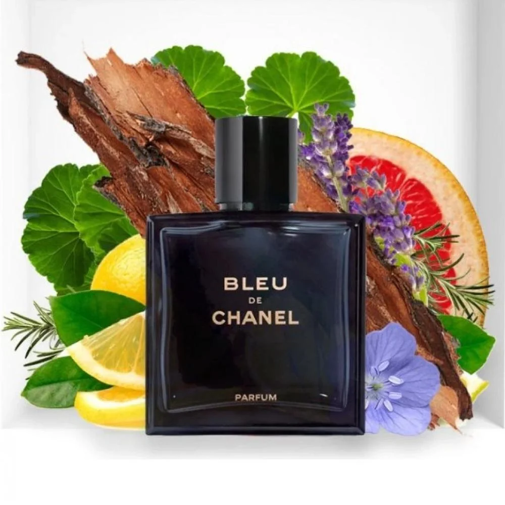 عطر Bleu de Chanel يتكون من بشر الليمون، البرغموت، النعناع، الشيح، الخزامى، الأناناس، إبره الراعي، النوتات الخضراء، خشب الصندل، خشب الأرز، خشب العنبر، أيزو إي سوبر، وحبوب التونكا.